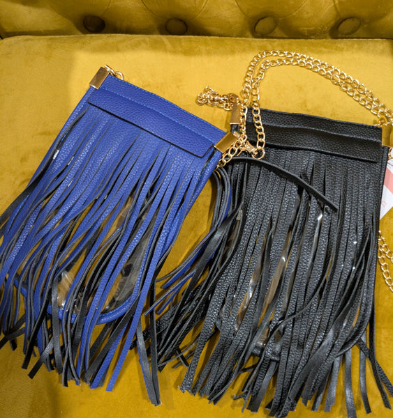 Gold strap messenger. Clear for stadium restrictions. Fringe design. 7 by 9 inches. Allow 2-5 business days for delivery