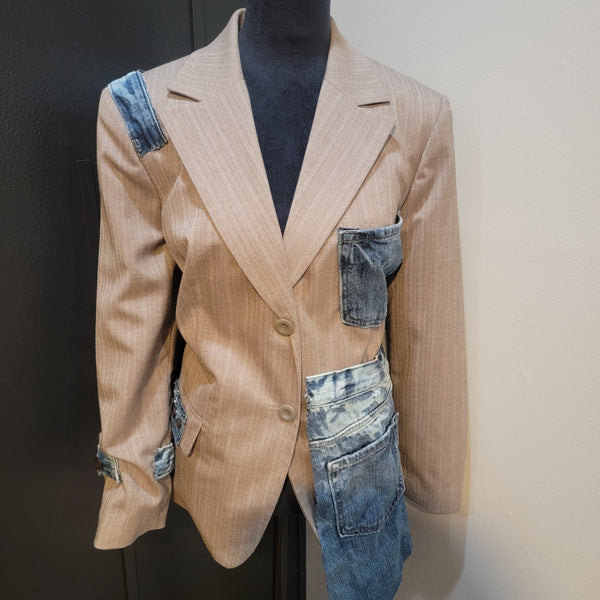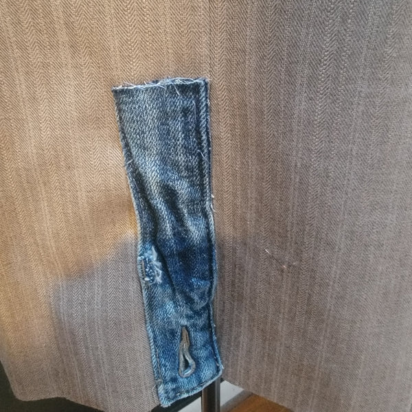 Non stretch material. Fully lined. Bleached distressed denim accent. Exclusively at Ysyntricity. Allow 5 business days for delivery