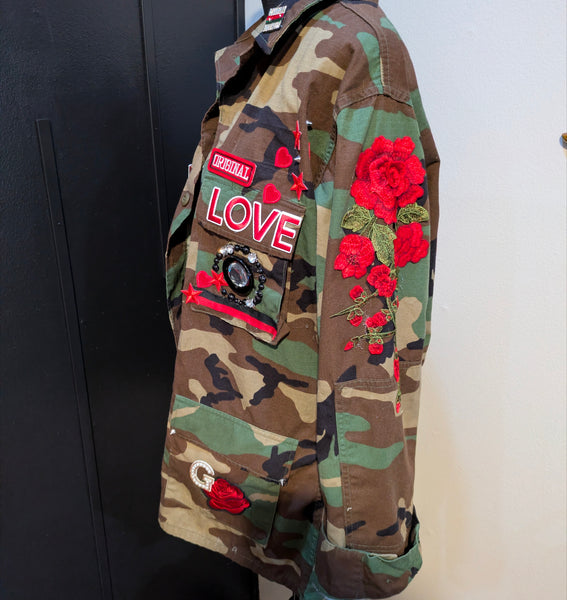Vintage camo jacket. Embellished with jeweled and embroidered patches. Allow 5 business days. Custom jacket. Original